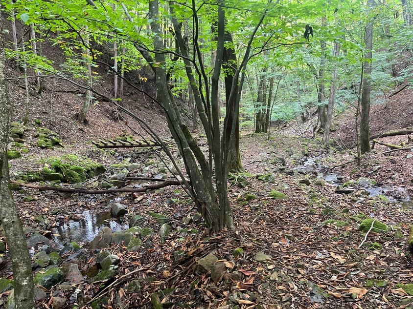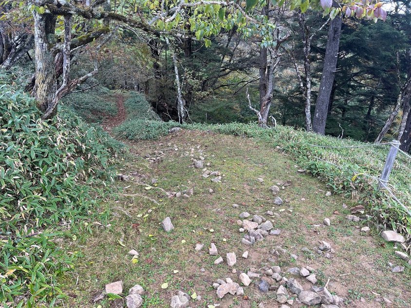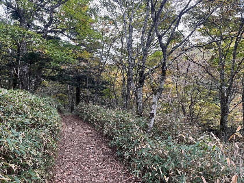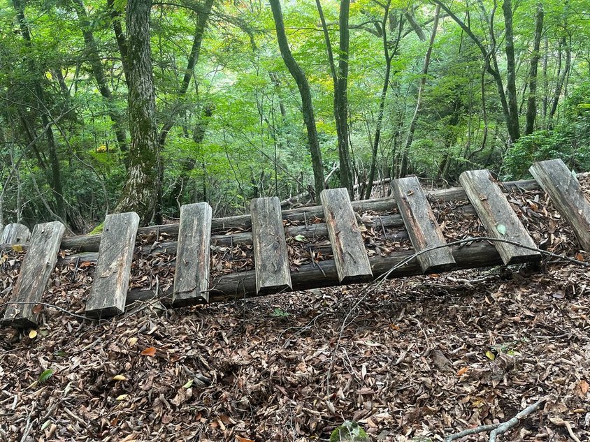 それにしても歩きやすい。登山道として開通させたわけではないので、段差をなくして歩きやすくしたのかな?着物を着た女性も歩いたんだろうから・・・。登山道は地図上では尾根道だが、実際は尾根の少し下の山腹を沿うような道。幅もそれなりにあるので危険な箇所はない。旺文社の地図には『クマに注意』の文字があるエリア。まあこっちの音に築いて逃げるだろう、と気にせず進む。もちろんクマに遭遇しなかった。1箇所ほど朽ち果てた梯子があたが、流石に渡るのは避けました。そして二箇所目のベンチがあるノーメダワに到着(0850)。チョコを食べて休憩。