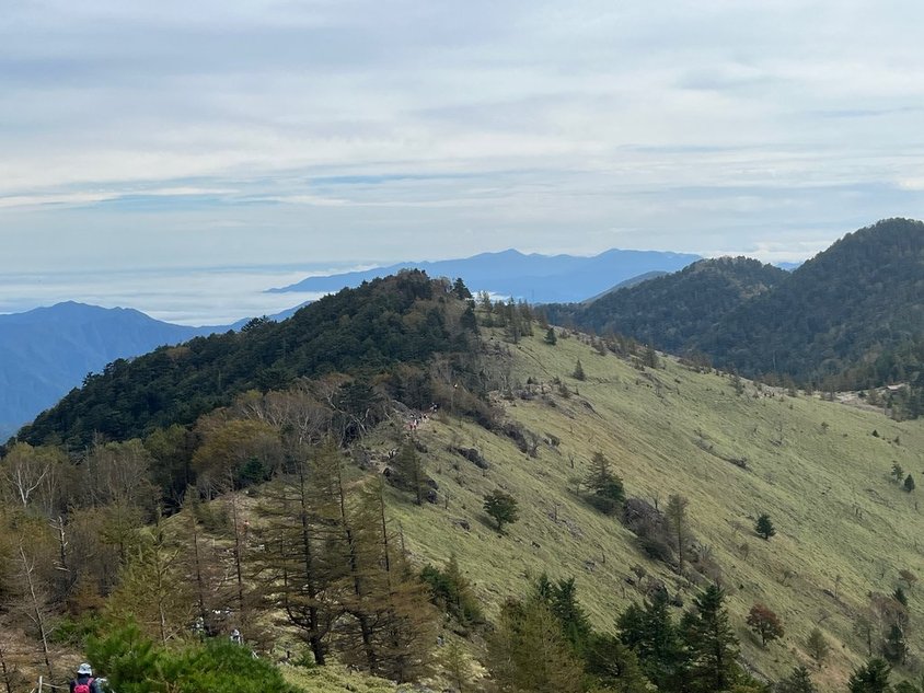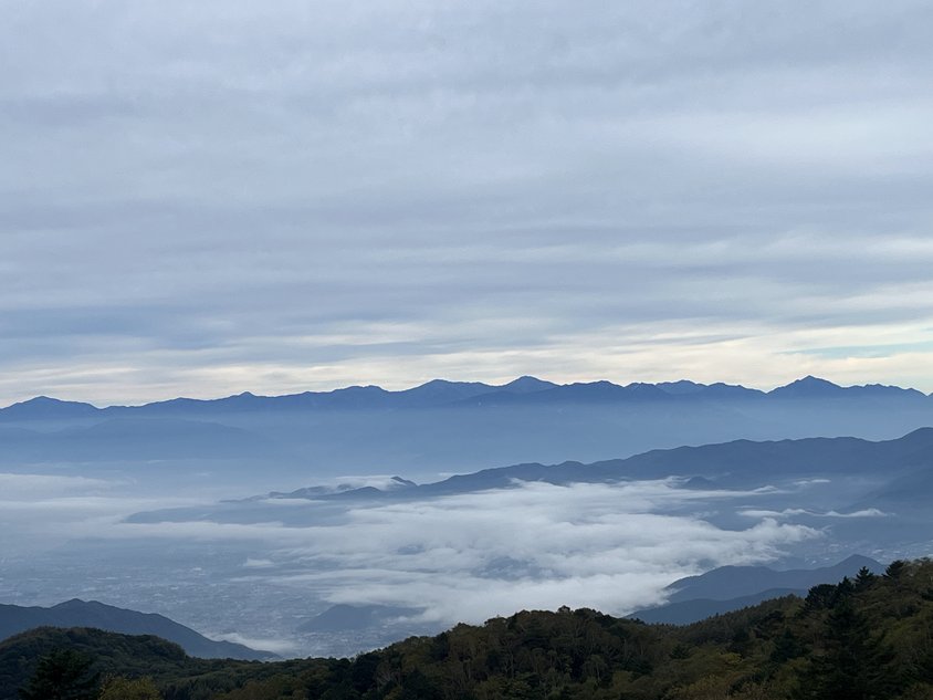 曇っているが南アルプスが全部見える。晴れた青空であれば最高だろうな~。親子(父親と娘さん)と家族(両親と息子さん)のパーティが小屋から出てきた。挨拶し小生は暫し景色を楽しむ。