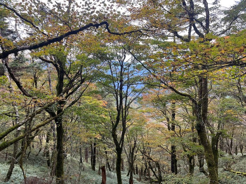 雨はないだろうと判断。ザックカバーもなく出発(0625)。もちろん他のテント泊の方はまだ食事中 ?峠までも歩いた道。少し紅葉した樹林帯(車も通る)を進み峠に到着(0710)。