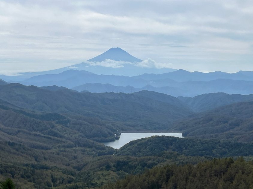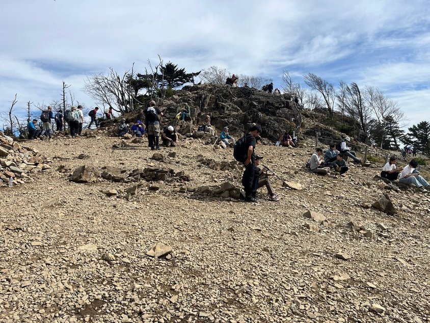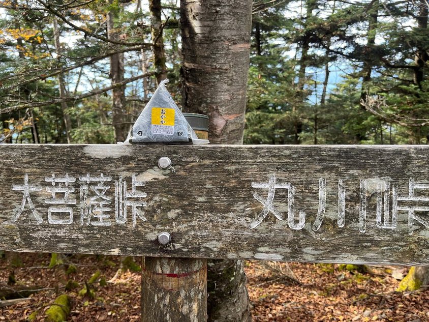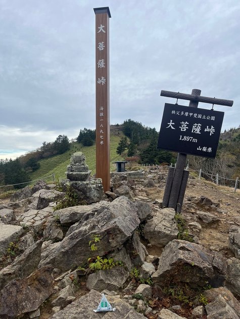 いる物だけ持って出発(1100)。唐松尾根は上の方が少し岩場(ガレ場?)だった記憶が。樹林帯を進むが登山者が多い。樹林帯を抜けると富士山が見える。少し開けたスペースでは登山者が休憩して景色を楽しんでいる。まあ上の方で見ればよいと判断し、休まず進む。雷岩に着いたが、驚くほどの登山者。人気の大菩薩!!3月の谷川と同じぐらいいたかな。