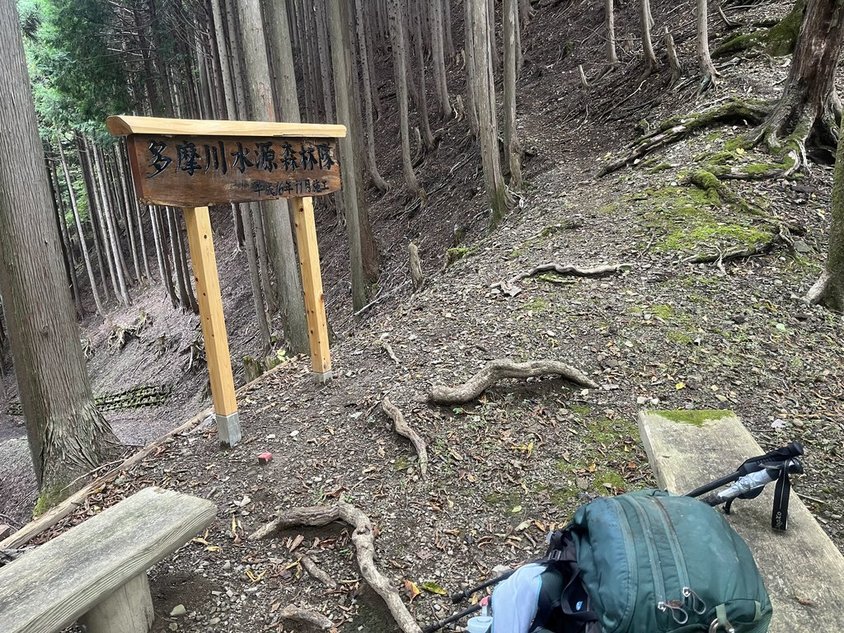 古甲州街道も残り2割ほど?どこまでも歩きやすい道。次第に植林された樹林帯に変わっていった。立派な標識とベンチのある所に到着。休憩。標識には『多摩川水源森林隊』と書いてある。