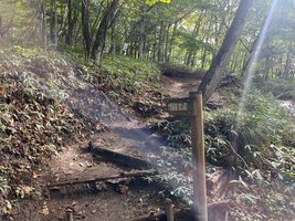 それにしても歩きやすい。登山道として開通させたわけではないので、段差をなくして歩きやすくしたのかな?着物を着た女性も歩いたんだろうから・・・。登山道は地図上では尾根道だが、実際は尾根の少し下の山腹を沿うような道。幅もそれなりにあるので危険な箇所はない。旺文社の地図には『クマに注意』の文字があるエリア。まあこっちの音に築いて逃げるだろう、と気にせず進む。もちろんクマに遭遇しなかった。1箇所ほど朽ち果てた梯子があたが、流石に渡るのは避けました。そして二箇所目のベンチがあるノーメダワに到着(0850)。チョコを食べて休憩。