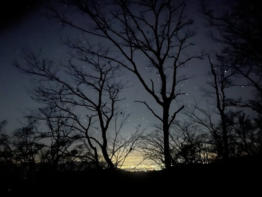 小屋の中には5~6名が休憩・昼食中。まさか泊る人はいないだろう。頂上へ行っても仕方ないので、小屋に入り休憩者がいなくなったところで寝床の準備。そして早速一次会。ワンパターンの餃子とビール。飲み終わってワインとビスケット。誰もいない小屋でのんびり。昼寝をして16時から二次会。もちろん誰も来ない。暗くなり、夜景を見ながらワイン。至福のひと時。そして就寝。夜中に起きて星空観賞。