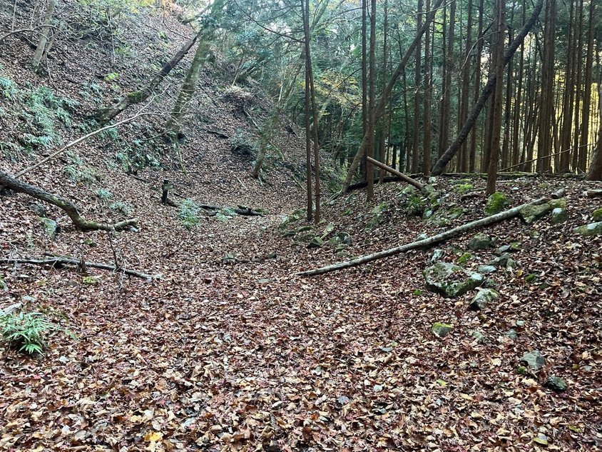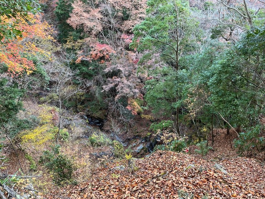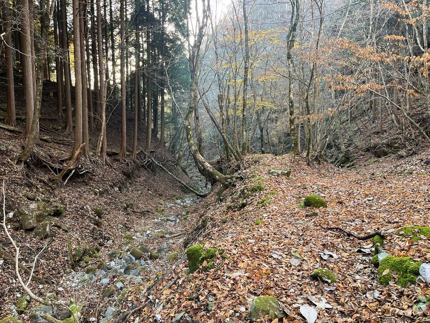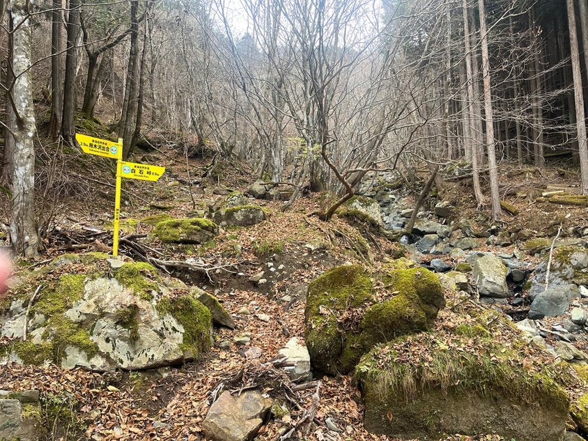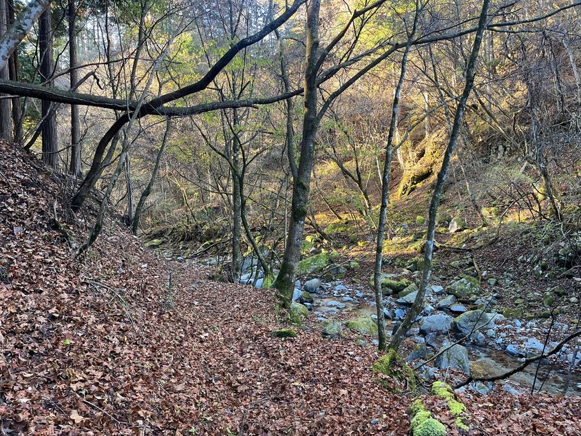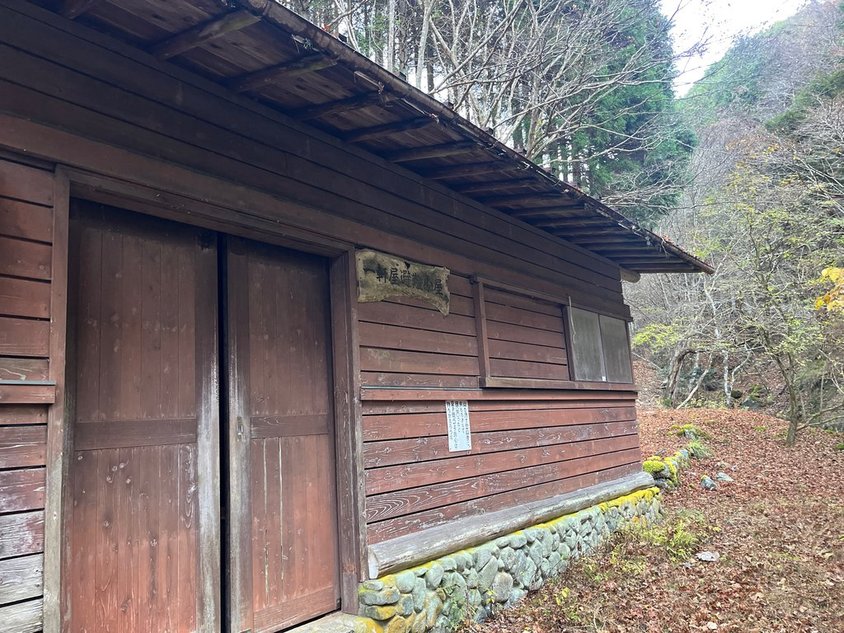 ここから先は歩いたことがない道。しかし畦ヶ丸に登るルートとしてはポピュラーなのだろう。落ち葉は結構踏まれている。道も歩きやすい。沢に出てきた。暫く進むと一軒屋避難小屋が見えてきた。