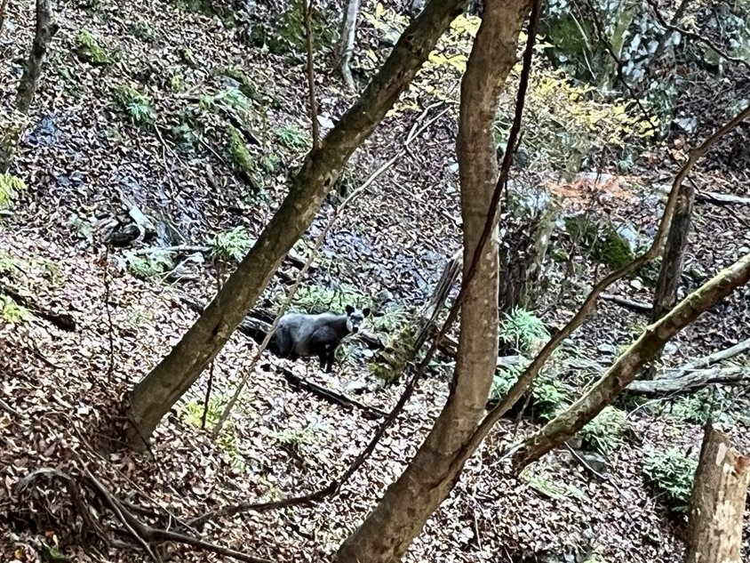途中右が崖の登山道で崖を後ろから走り追い越す黒影が!熊?まさかあの崖を熊が走れるわけはない。イノシシ?シカ?黒かったからやはり熊?暫く進むと前方に何か?ニホンカモシカか!