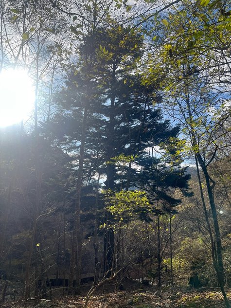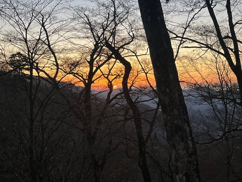 気温が高いので霜柱もあまり出ていない。滑る心配もない。日の出を迎えた。木の間からの日の出。