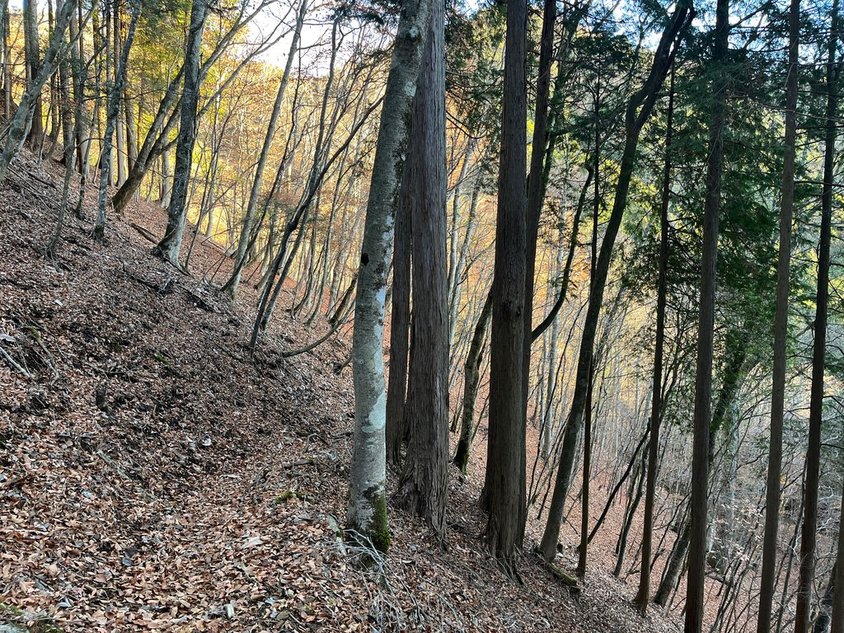 ニホンカモシカは白っぽいのから黒っぽいのまで色々いるからな。ニホンカモシカに挨拶して先に進む。分岐?左右に踏み跡が。右に進むとロープで沢に下りれる。下りてみたが道がない。戻って左に。こちらが正解。