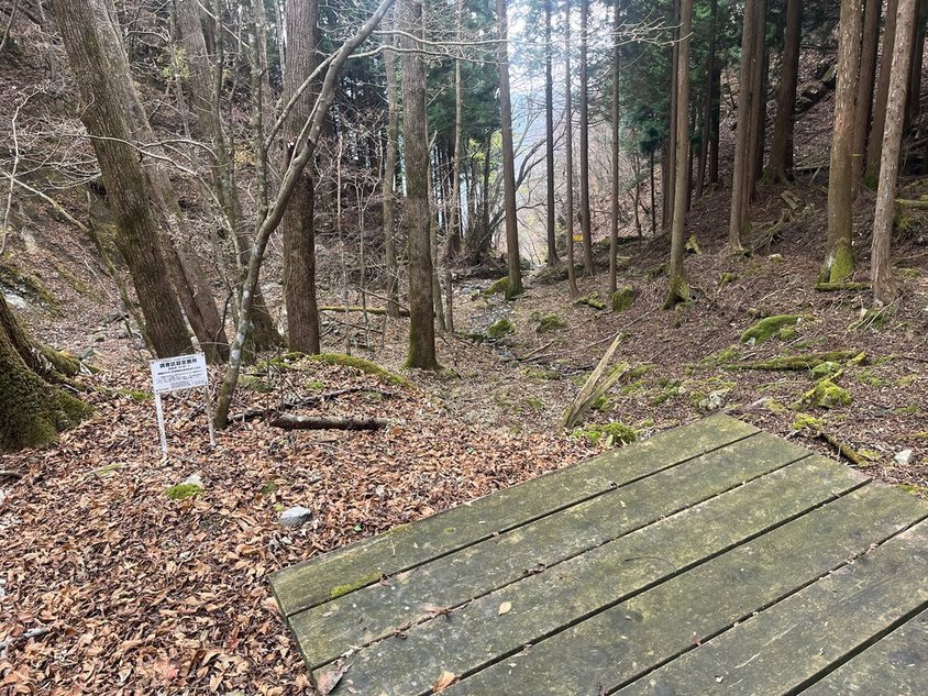 結構きれい。中を覗く。休憩だけかな?と思ったところ奥まったところに小上がりのスペースがある。棚もある。泊れるな!でも登山口にあまりにも近い。そして冬なのに少し湿った感じがする水は沢を煮沸すれば問題ないが、トイレはない。利用することはないかな?先に進む。沢沿いの道が続く。