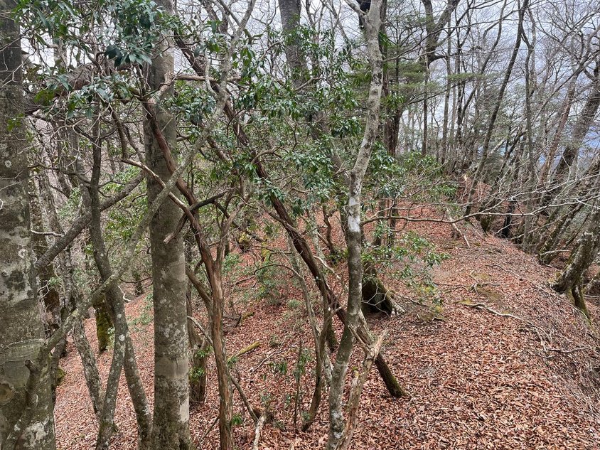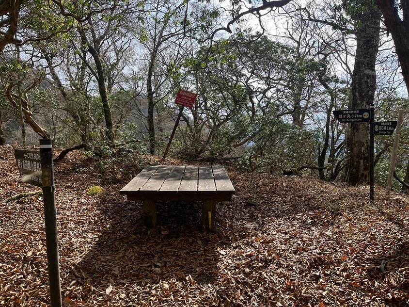 加入道山へ行っても仕方ないし休憩にも少し早い。記憶では、後はアップダウンも少ない稜線歩きのはず。先に進む。名前は憶えていないがあるピークに到着。ベンチもあるのでここで休憩。残り2時間前後のはず。途中で一本取れば今日のお宿に着く。眺望はないが稜線歩き。別のピークに到着。ベンチで先客が昼食中。小生も休憩。