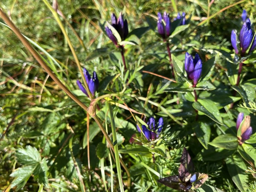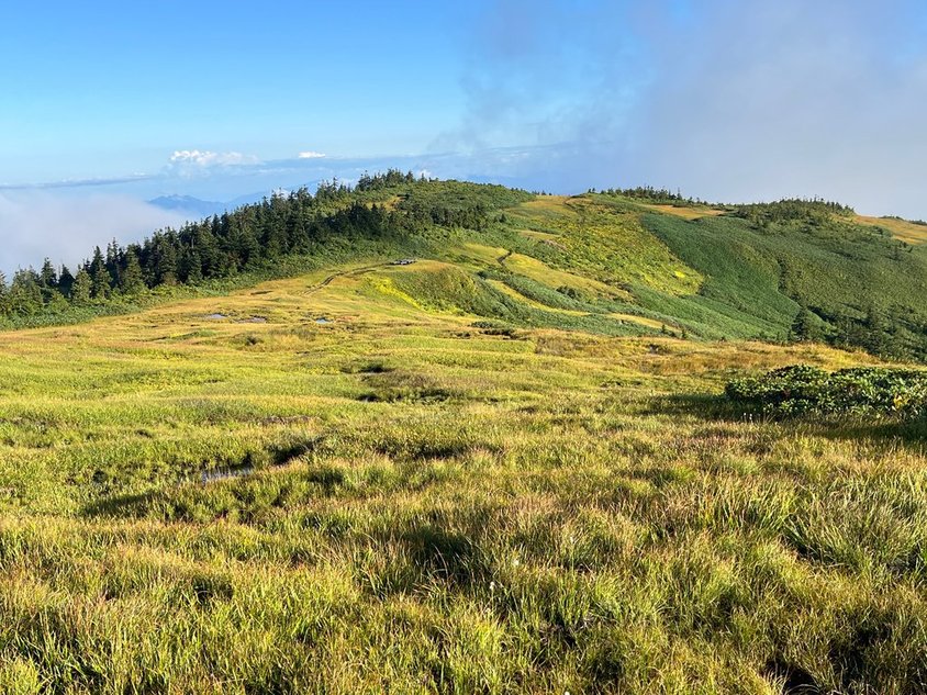 天気は曇り。ガスってなにも見えない。日の出もなし。しかし途中から日が差してきた。晴れるか?とりあえず中門大池までピストンして、天気次第で下山 OR 御池の判断をすることに。空荷(水・行動食・雨具・エマージェンシ―BOX)で出発(0615)。時間とともに雲が晴れてきた。日光連山方面はくっきり!しかし燧はまだ。頂上直下で燧も見え始めた。稜線が綺麗に見える。もう少し遅ければ黄金色の稜線が見えたのに・・・。リンドウが咲いている。秋だな~。