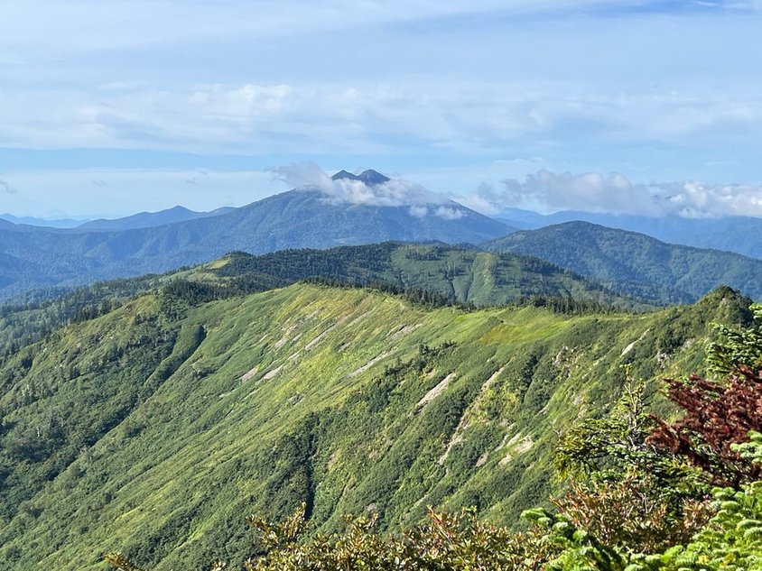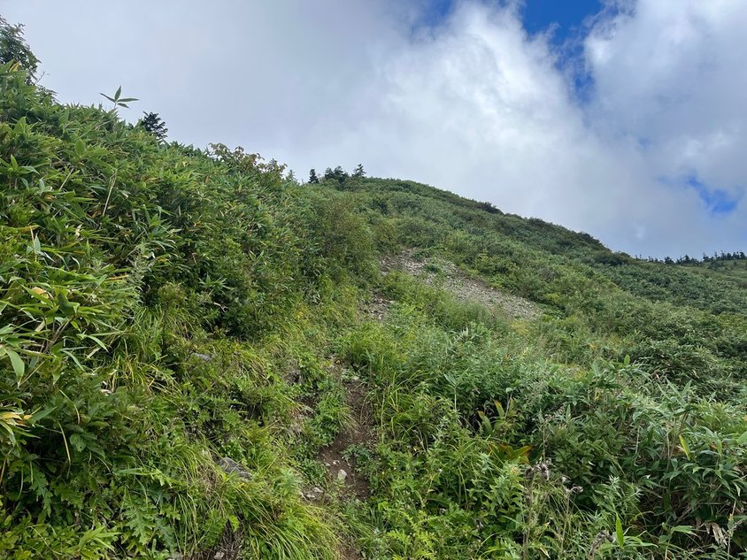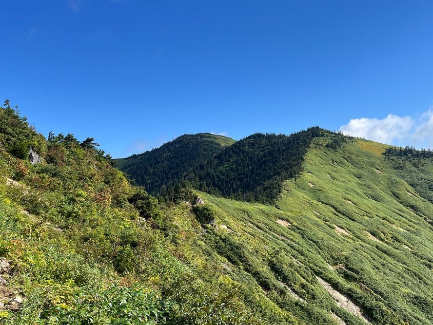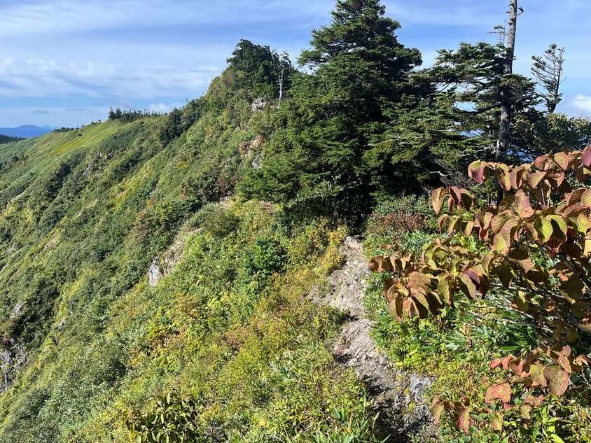 ポカリ1ℓ、水0.5ℓではマイルール(下山時に水0.5ℓ残す)が守れそうにないので水を購入して出発(0800)。出だしは少し急。滑らないように進む。前方の岩場までが少し危険個所(左に滑落すれば・・・)。慎重に行けば全く問題なし。ザックがでかいのでぶつけないように注意。稜線は気持ちいい。