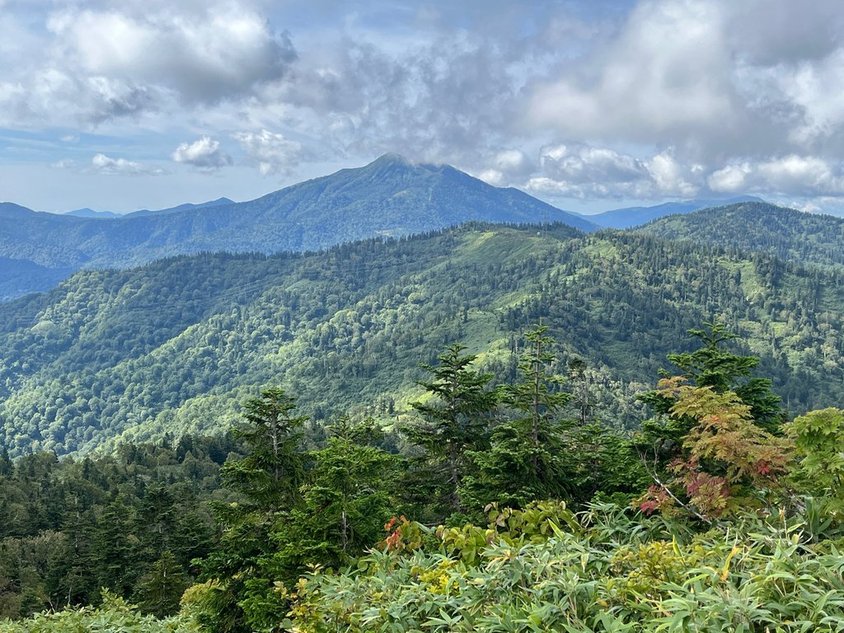 燧は少し雲がかかっているが、後方の会津駒はくっきり見える。これで紅葉であれば大満足だが。アップダウンもあまりない稜線。キリンテの分岐である大津峠に到着(0910)。ここで休憩。