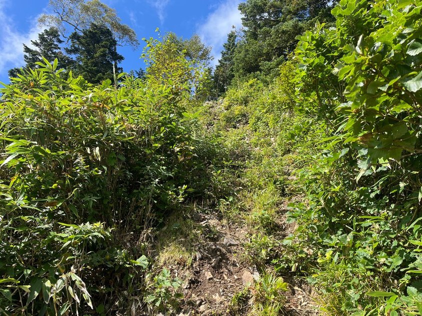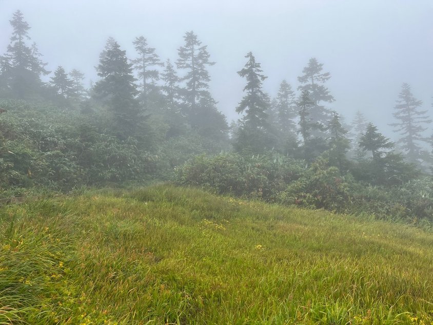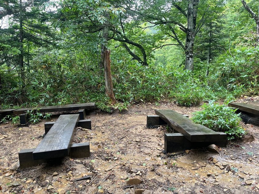 7月に比べれば暑さは劣るが、ザックが重いこともあり直ぐに汗がしたたり落ちてくる。CTよりも少し時間がかかったが看板のあるいつもの休憩場所に到着(0830)。20kgないのでもう少し早く歩けなければならないが・・・。男女ペアの方が到着。後で色々お話ししたが、女性の方は健脚!!読売新道もテントで行ったよう。小生にはまねできない。ここから水場まで休憩なしで行けるかな?見覚えのある登山道を進すすむ。大雨ではないが降り続く。登山道も少し水が流れるような状態になった。あえぎながらも水場に到着(0955)。水場の補給はなし。足りなければ購入だな。