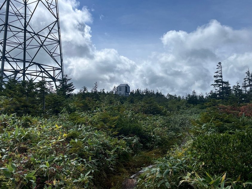 ここから少し行ったところに急坂があった記憶がある。暫く進むと記憶とは少し違ったが急坂登場。登ってくる登山者も。逆ルートは嫌だな。遠くに作業者用小屋が見える。距離的にけっこうあるがアップダウンはない。急坂を下って深く無い樹林帯に入り鞍部に到着。