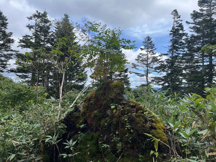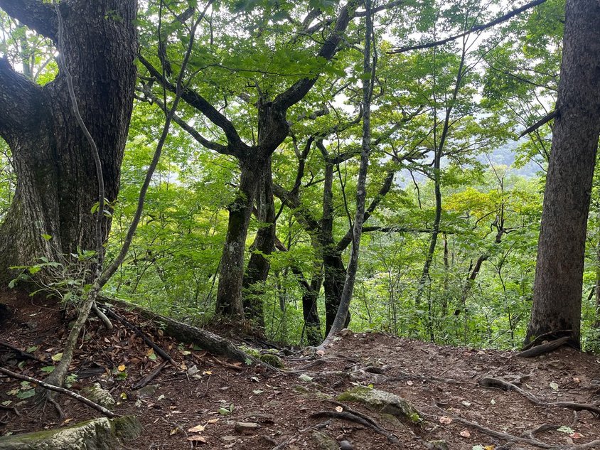 この後は大杉岳で一本取って御池まで。急登も急坂もないはず。しかし標高が下がるし風も抜けないので暑いか?次第に植生も変わってきた。樹林帯に入る。頂上は樹林帯で展望もなく、ベンチもなかった記憶。少し登り返して大杉岳に到着(1140)。