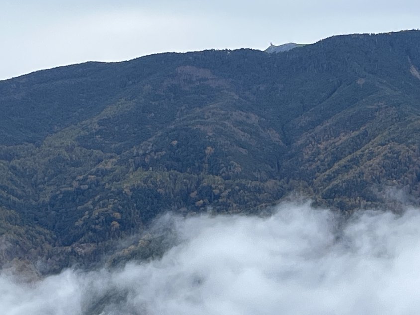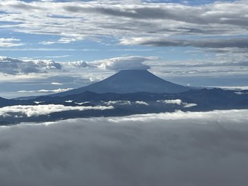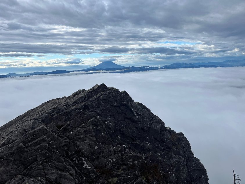 掃除して出発(0550)。日の出の時刻は過ぎているが太陽は見えない。しかしヘッドランプはもちろんいらない。誰もいない登山道を進む。樹林帯を出て振返れば雲海の向こうに富士山が!!笠をかぶっているので天気は悪くなる方向。しかし雲海の向こうの富士が綺麗。