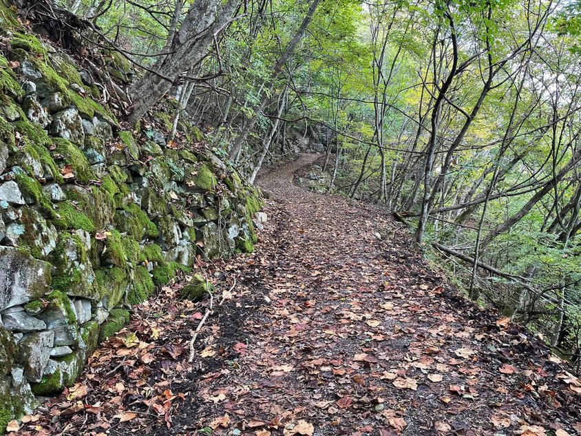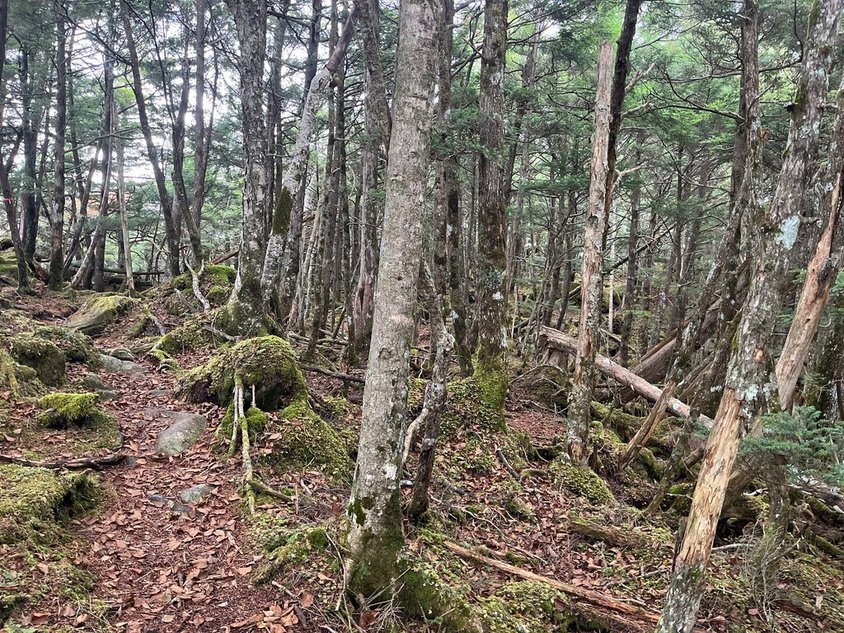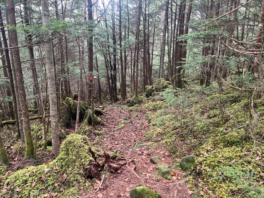 ここから先は奥秩父らしい苔むした樹林帯にはいる(高原ヒュッテ分岐までは少し岩場)。雨がちらほら。樹林帯なので雨具なしで進む。良い感じの樹林帯。アップダウンも少なく歩きやすい。