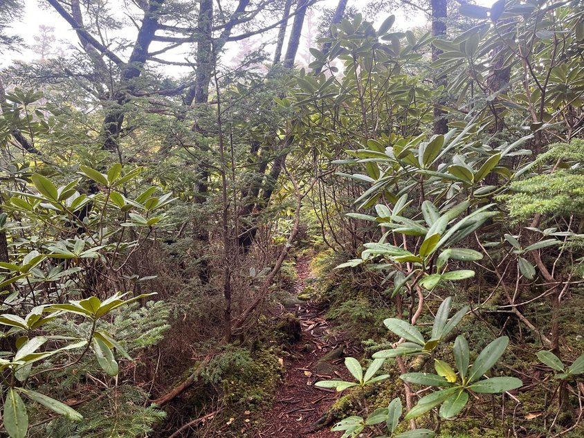 シャクナゲの樹林帯を過ぎて急とは言えないが坂が続く。段差がないので歩きやすい。