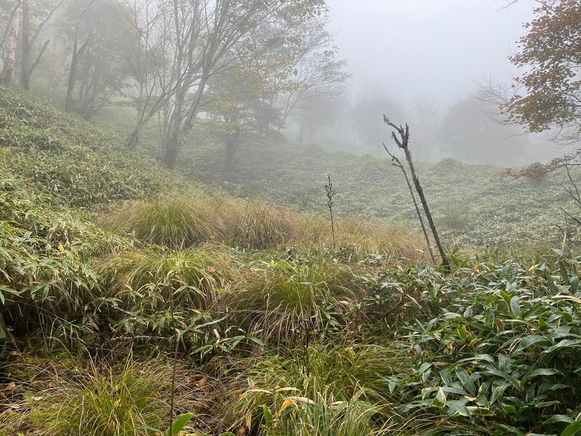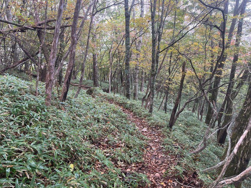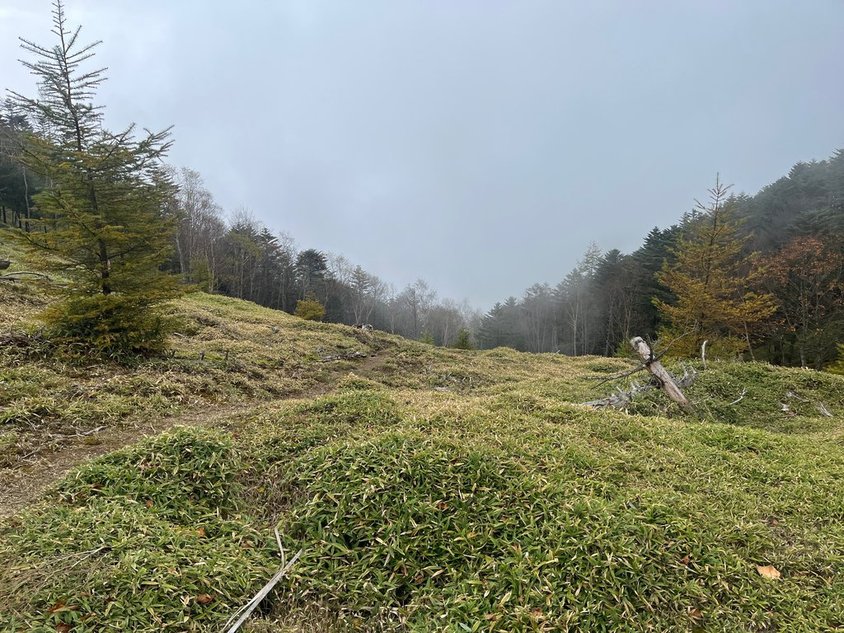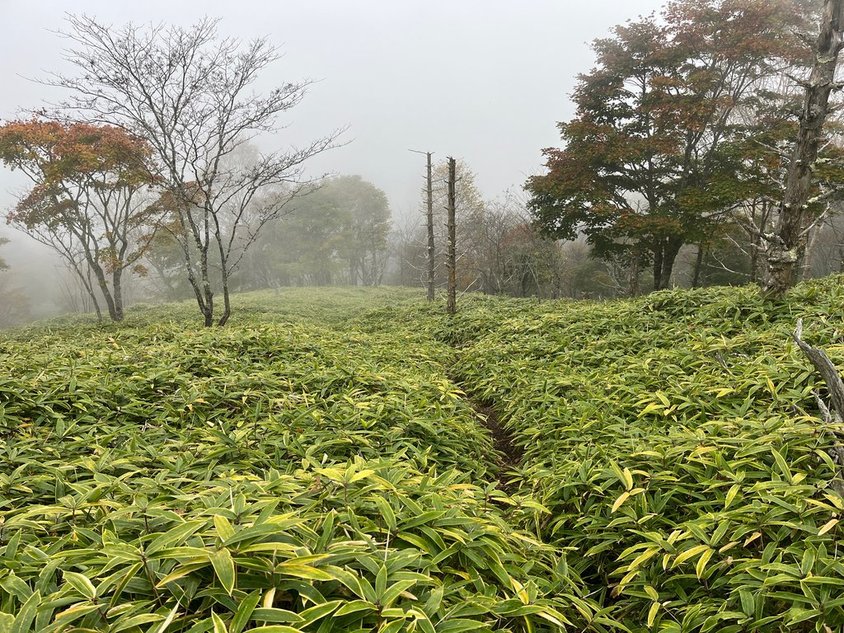 樹林帯と思っていたが笹の登山道。深くはないが膝下ぐらい。雨露でぬれているので雨具を着ていた方が良かった。膝から下はズボンが濡れた。笹も登山道が続く。途中、湿地隊みたいなところで少し景色が変わったがほとんど笹。
