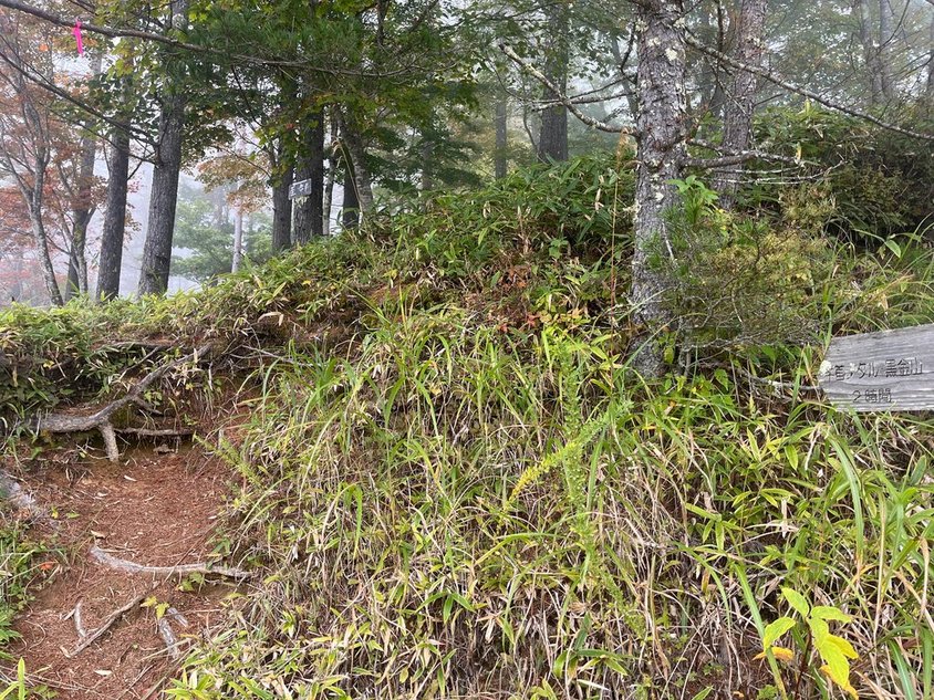 雨は降っていないが雲は低い。まあ~のんびり歩いても2時間強だろう。降ってくれば雨具を着ればよい。道も険しい所はないはず、と判断しそのまま出発(0800)。車で通ってきた林道を戻る。途中で県警の車とすれ違う。「これから周回ですか?」の問いに「今日はヒュッテに泊まってのんびりです」と答えたら笑って「ご安全に!」と挨拶を返してくれた。牧場の少し手前で、乾徳山へ向かう分岐に出会う。