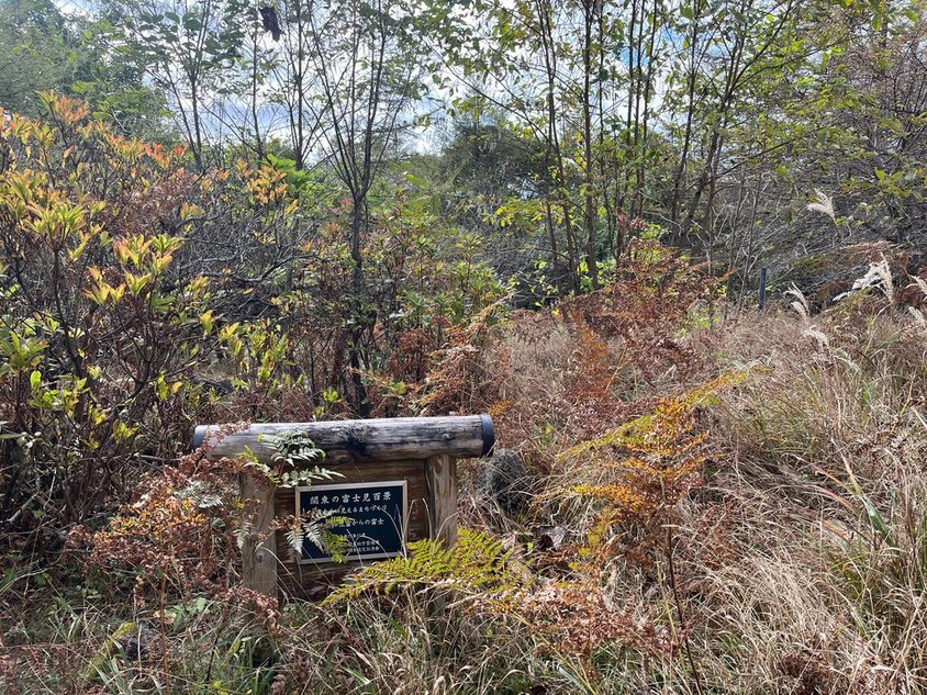 牧場からの登山者3名が登って行った。小生は休憩して再出発。なだらかな登りをしばらく歩くと道満山への分岐に到着。ここからは何回も通った(いつも下りのルート)ところ。暫く進むと富士山絶景の看板。今回もまた富士山が見えない。今まで見た記憶がない。そしてヒュッテに到着(0945)。